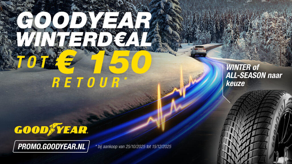 Koop tussen 25 oktober en 15 december 2025 vier Goodyear Winter- of All Season-banden en krijg tot €150 cashback van Goodyear. Alle actievoorwaarden en aanmelding op promo.goodyear.nl